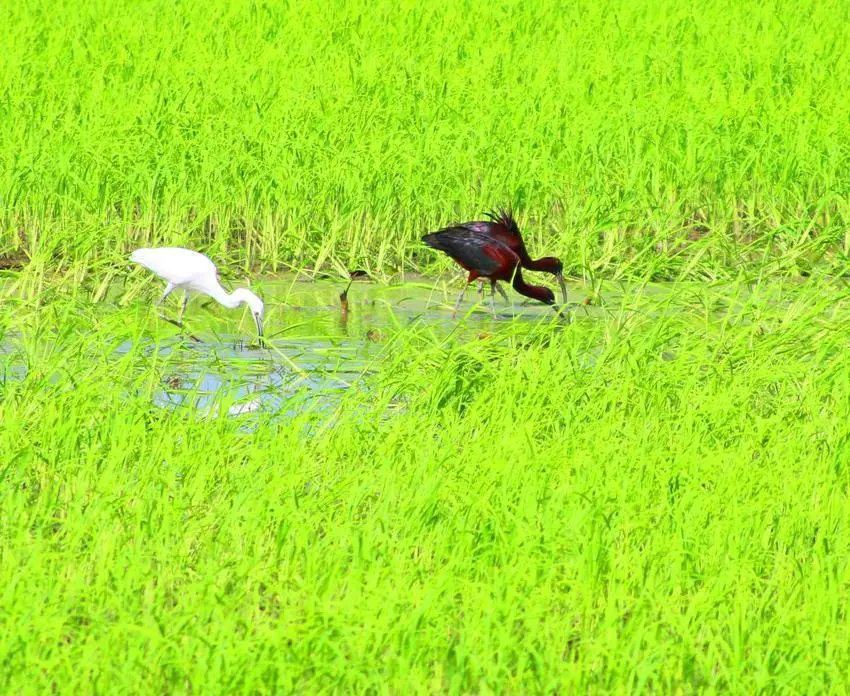 朱湖湿地公园的持续生态修复和野生动植物资源保护为彩鹮提供了理想栖息地。近年来,朱湖通过重建4608公顷生态保育、恢复重建等区域,打造浅水沼泽、稻田复合湿地,为彩鹮等鹳形目,以及雁形目、鹈形目等鸟类精准匹配“依赖浅水湖泊觅食”的习性,优化了栖息环境。同时,联合林业、公安、湖泊、渔政、环保等部门开展无人机巡护,设置文明观鸟区,减少人类干扰,园区内鸟类种类丰富,形成完整食物链,提升了生物多样性。