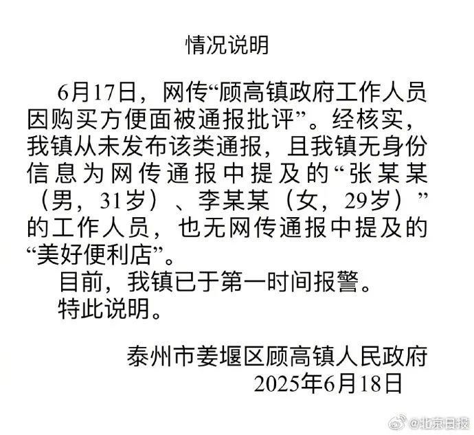 6月17日,网传“顾高镇政府工作人员因购买方便面被通报批评”。经核实,我镇从未发布该类通报,且我镇无身份信息为网传通报中提及的“张某某(男,31岁)、李某某(女,29岁)”的工作人员,也无网传通报中提及的“美好便利店”。目前,我镇已于第一时间报警。特此说明