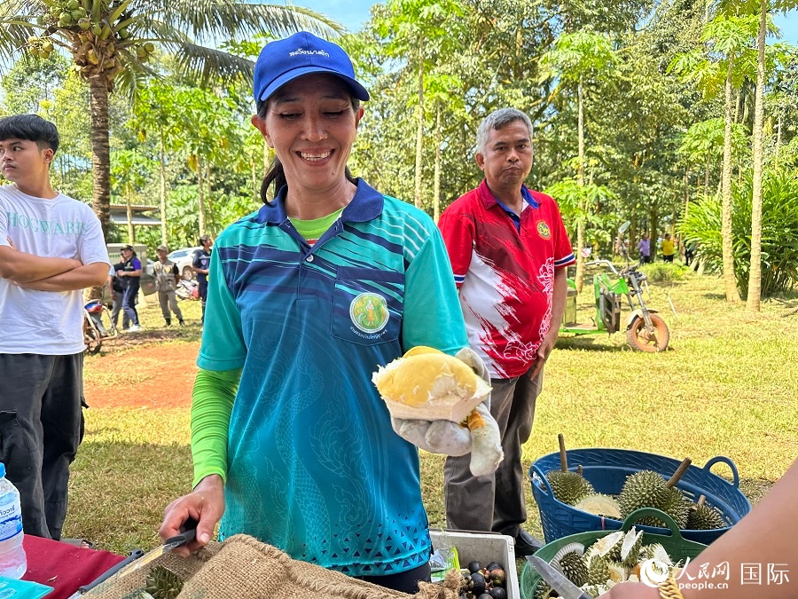 当地民众在春蓬府果园品尝榴莲。人民网记者 孙广勇摄