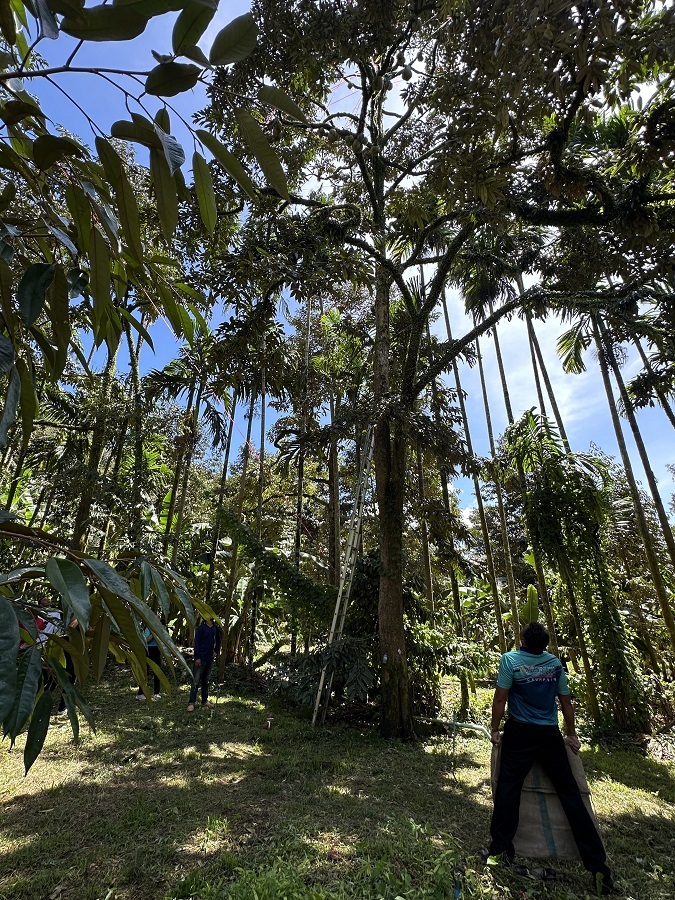 春蓬府果农从高高的榴莲树上收割榴莲。人民网记者 孙广勇摄