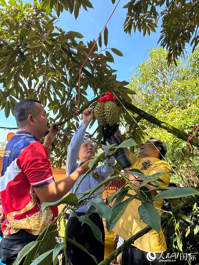中泰嘉宾共同收割第一颗榴莲。人民网记者 孙广勇摄