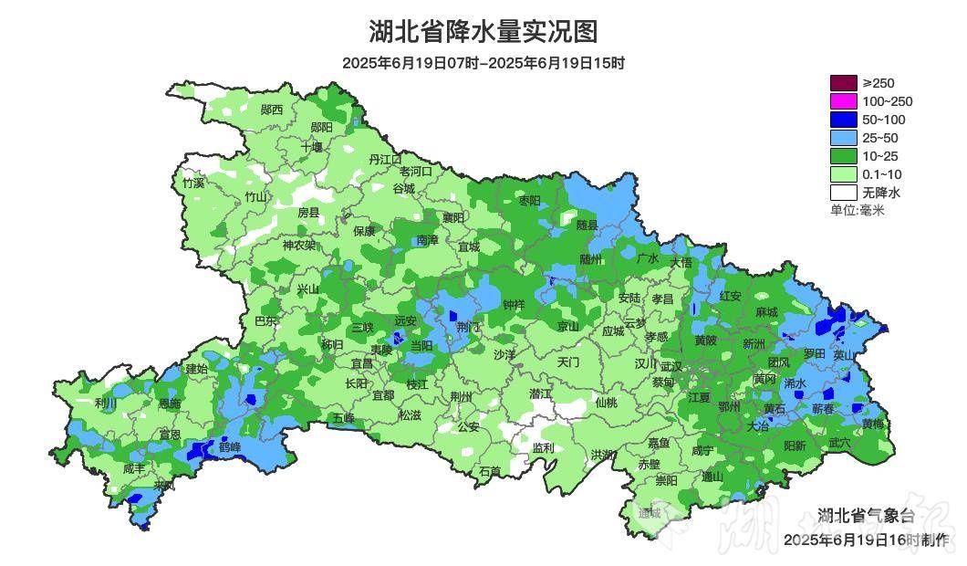 气象观测显示:19日白天,恩施、宜昌、襄阳、随州、荆门、孝感、武汉、鄂州、黄冈、黄石等地雨势较大,累计雨量超过50毫米,最大为来凤县百福司镇85.7毫米,最大小时雨强为蕲春县株林镇40.5毫米(19日12时),其他地区小到中雨。受降雨的影响,气温较18日进一步下降,15时全省大部为24至29℃,十堰、襄阳、随州、孝感等地同比降温6℃左右。