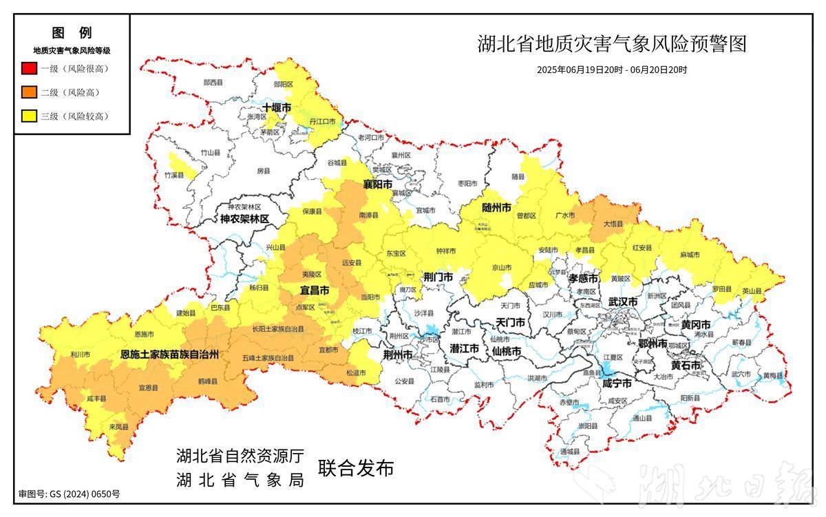 湖北日报讯(记者曾莉)湖北省自然资源厅、湖北省气象局联合发布地质灾害气象风险预警称:6月19日20时至6月20日20时,预计三峡库区(兴山县东部、秭归县、夷陵区),宜昌地区、恩施地区、随州地区,十堰(茅箭区北部、张湾区东部、郧阳区东北部、竹溪县中部、丹江口市)、襄阳(谷城县东南部、保康县、南漳县、宜城市西南部)、荆门(掇刀区、东宝区、漳河新区、高新区、钟祥市、京山市)、荆州(松滋市)、孝感(安陆市、孝昌县、应城市北部)、武汉(黄陂区北部)、黄冈(红安县、麻城市、罗田县、英山县)以及其他强降水区域发生崩塌、滑坡、泥石流的风险较高;其中,三峡库区(兴山县东部、秭归县东南部、夷陵区西部、北部和东部),襄阳(保康县东部、南漳县西部)、宜昌(点军区、远安县西部、当阳市西部、长阳县大部、五峰县、宜都市南部)、恩施(恩施市西南部、巴东县南部、建始县中部和南部、利川市南部、咸丰县北部和东部、宣恩县、来凤县、鹤峰县)、荆州(松滋市西部)、随州(广水市东部)、孝感(大悟县)发生崩塌、滑坡、泥石流的风险高。
