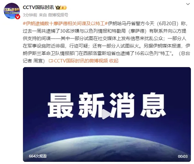 另据伊朗媒体报道,伊朗伊斯兰革命卫队情报部门在伊朗西部洛雷斯坦省逮捕了16名以色列“特工”。