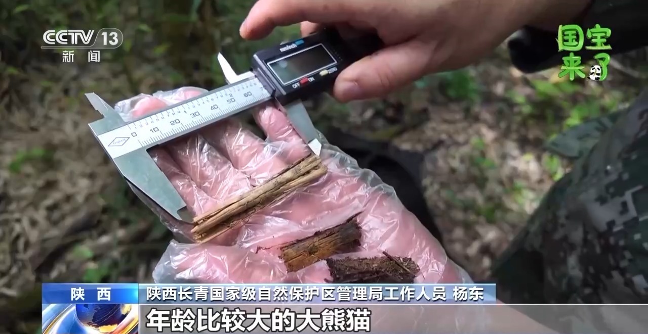 陕西长青国家级自然保护区管理局工作人员 杨东:这个咬节有71毫米,说明这是个年龄比较大的大熊猫,消化功能也不好,牙齿也不行,咬节就比较长。另一个只有42毫米,说明这是个成年的健壮的大熊猫,咬节比较细。通过这两个咬节我们就可以确定,有两只不同个体的大熊猫在这个区域活动。