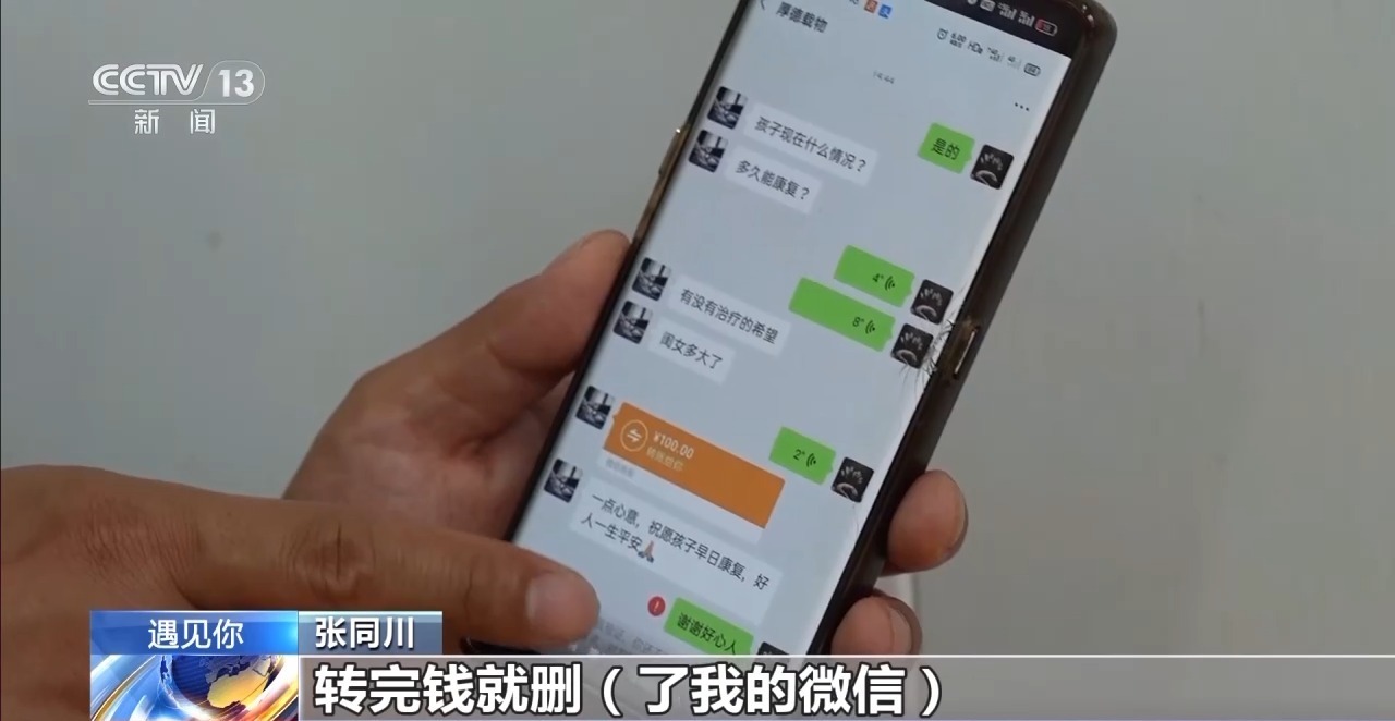 张同川:济南当地,全国各地的网友,很多爱心人士给我们捐款捐物,包括来到我们当时的出租房里面去看孩子,安慰孩子,给我们鼓励。转完钱,我说谢谢好心人,就发不过去了,转完钱就删了我的微信,连个名字我都不知道。