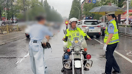 △孝感中考考点附近,有部分路口因暴雨导致拥堵,骑警队员郑晖迅速赶往现场,在雨中进行疏堵保畅。