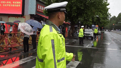 △武汉交警全警在岗,700余名警力顶风冒雨坚守全市94个考点,为莘莘学子撑起“安全伞”。