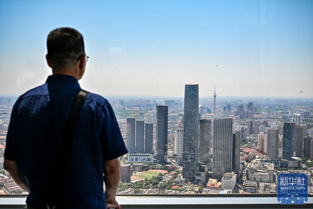 ↑ 6月22日,游客在“天津之心”津塔观光厅俯瞰天津城市风光。