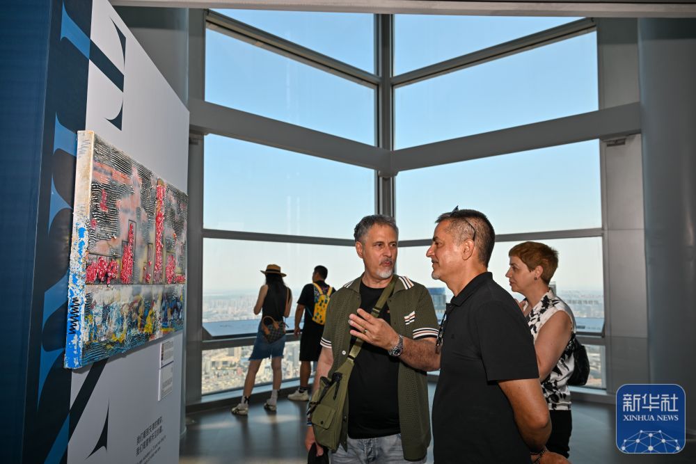 ↑ 6月22日,外国游客在“天津之心”津塔观光厅参观。