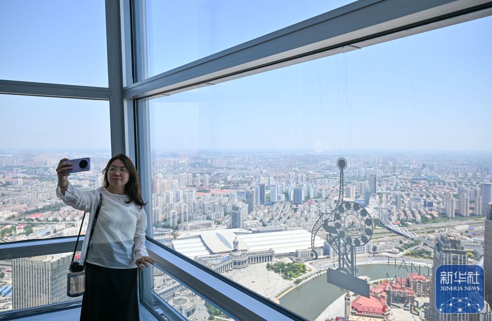 ↑ 6月22日,游客在“天津之心”津塔观光厅与城市风光合影。