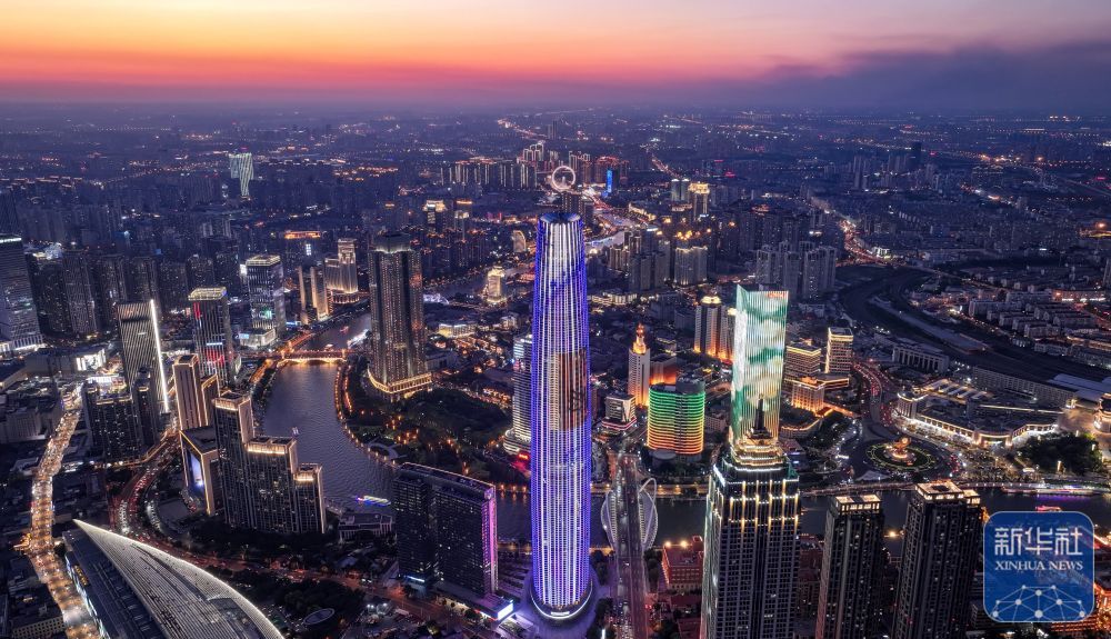 ↑ 这是6月21日拍摄的天津环球金融中心(中)(无人机照片)。