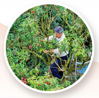 转过一个弯,眼前豁然开朗。彼此紧挨的树上,挂满了沉甸甸的红果子,煞是可人。“这些都是桂味,刚到成熟期,不少还带着青黄,要挑红的摘。”周小明把筐在树下铺稳,伸手探进密集的枝丫间,两手熟练配合,连枝带叶一起掐,一下一把。不一会儿,筐里就堆满了果实。