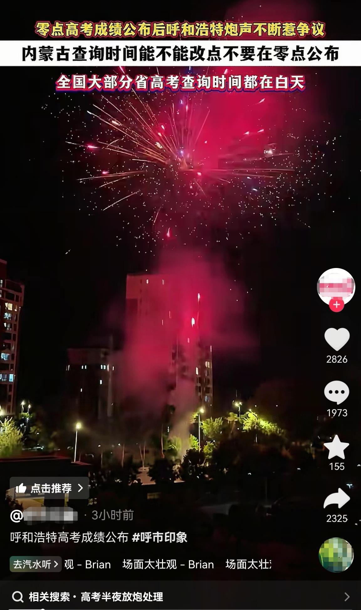 6月24日,内蒙古包头、呼和浩特等多地网友反映,当地高考成绩放榜后,凌晨有人燃放烟花爆竹庆祝。有网友认为,金榜题名固然值得庆祝,但能否改下时间,不要打扰到大家,毕竟很多人第二天还要上班上学。
