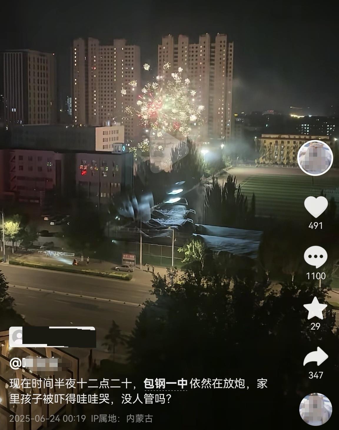 据IP地址为内蒙古的网友24日凌晨0时19分发视频吐槽称,都半夜了,包钢一中(已改名为包头市第九十五中学)依然在放炮,家里孩子被吓得哇哇大哭,没人管吗?极目新闻记者私信该网友,暂未获回复。