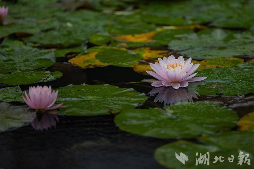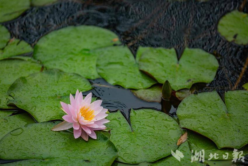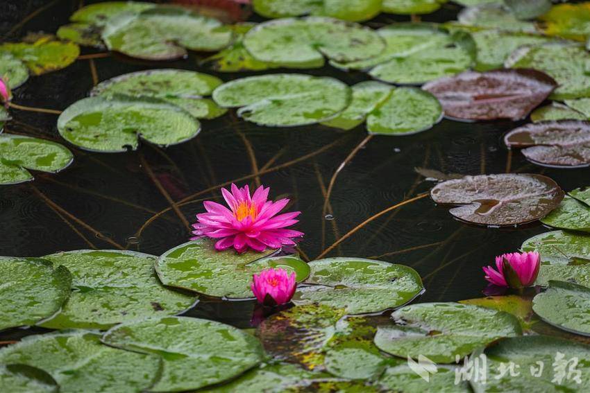 2025年6月23日,金银湖国家湿地公园内,雨珠轻砸莲叶,滚成透亮的水珠。睡莲如披着薄纱的仙子,黄、粉、紫的瓣影浸在青瓷色的涟漪里。(湖北日报全媒记者 倪娜 通讯员 晏君 摄)