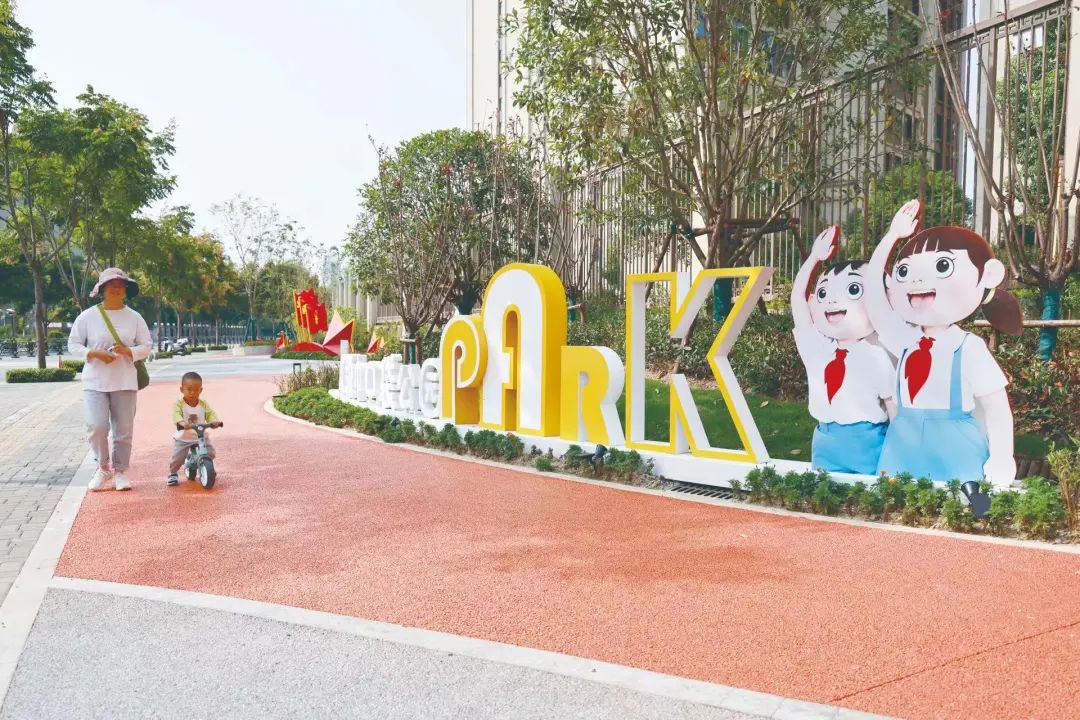 6月13日下午,放学时分的田家炳联合中小学门口,家长们三三两两坐在对面的红领巾主题公园里等候,鲜艳的少先队元素与绿植相映成趣。