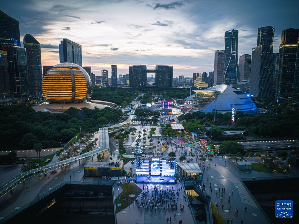 6月27日拍摄的位于杭州市上城区钱江新城的2025杭州奇妙夜活动主会场(无人机照片)。