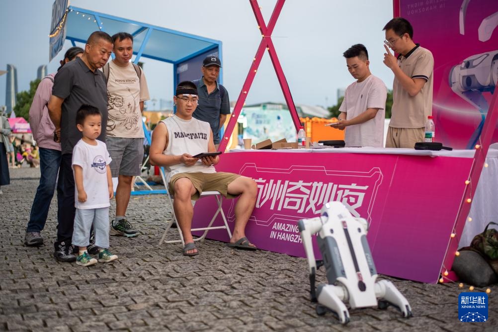 6月27日,市民在2025杭州奇妙夜活动主会场体验脑机接口技术操纵机器狗。