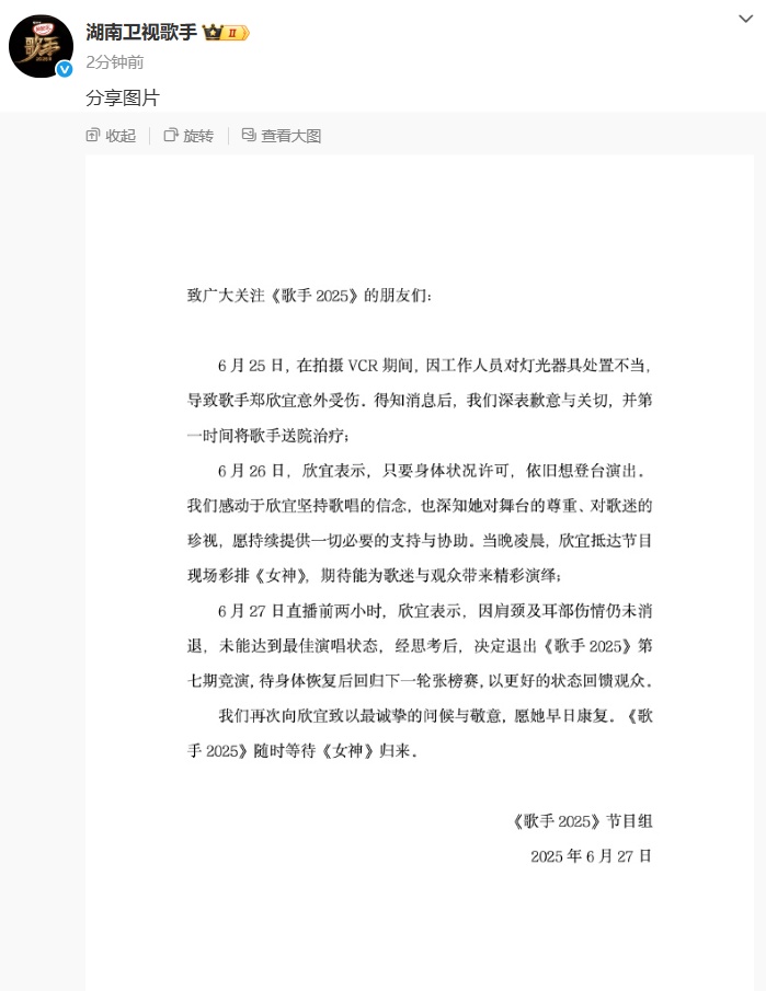 6月27日,@湖南卫视歌手发文,称郑欣宜受伤,因肩及耳部伤情仍未消退,未能达到最佳演唱状态,经思考后,决定退出《歌手2025》第七期竞演。