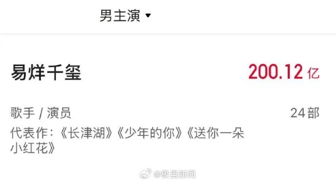 目前,票房总成绩排在易烊千玺之前的电影演员分别为:沈腾、吴京、黄渤、王宝强、刘昊然和张译。其中,沈腾和吴京的票房成绩已经进入“300亿俱乐部”,分别为369.79亿和347.17亿。数据显示,易烊千玺主演电影票房表现前三名为《长津湖》(57.75亿)、《满江红》(45.44亿)和《长津湖之水门桥》(40.67亿)。