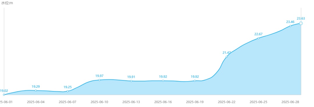 2025年6月1日至6月29日长江汉口站实时水情,可以看出明显的涨水趋势。图源:武汉市水务局