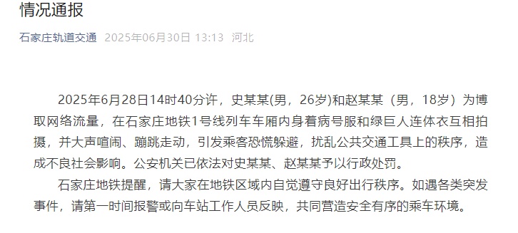 2025年6月28日14时40分许,史某某(男,26岁)和赵某某(男,18岁)为博取网络流量,在石家庄地铁1号线列车车厢内身着病号服和绿巨人连体衣互相拍摄,并大声喧闹、蹦跳走动,引发乘客恐慌躲避,扰乱公共交通工具上的秩序,造成不良社会影响。公安机关已依法对史某某、赵某某予以行政处罚。