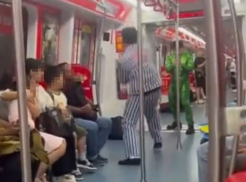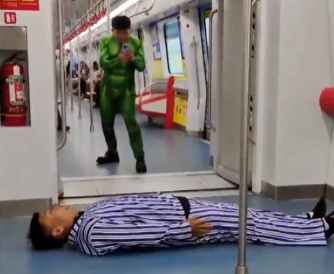两男子车厢内身着病号服和绿巨人连体衣互相拍摄,引发乘客恐慌躲避。6月30日,石家庄地铁发布情况通报: