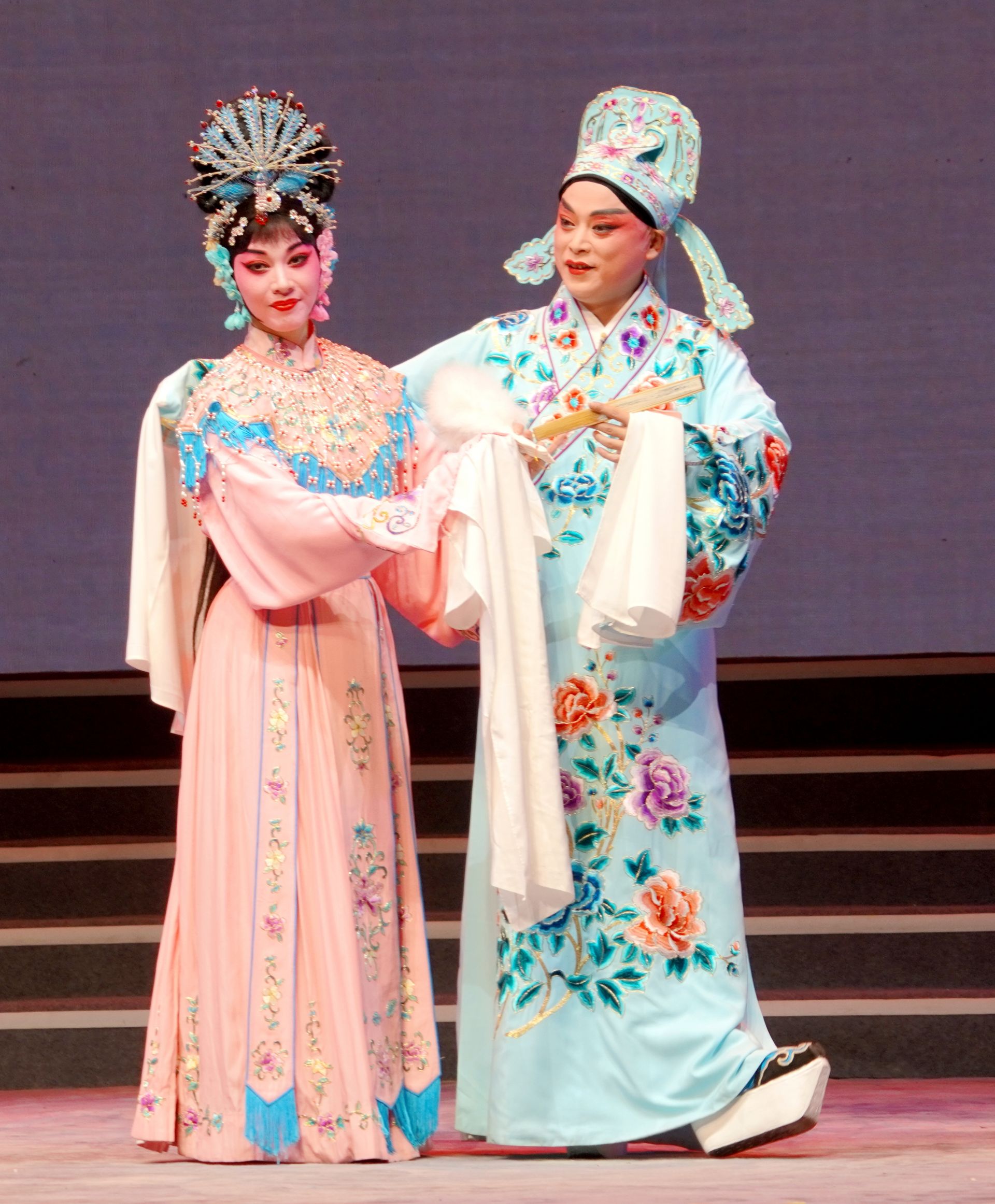 荣获“牡丹花”称号的演员朱昌敏(左)、柳建兵(右)表演《访友》片段。通讯员供图