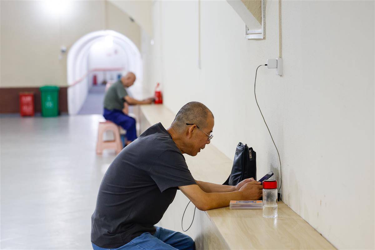 2025年7月1日,烈日炎炎,在武汉市黄鹤楼下的蛇山人防工程纳凉点,市民游客在里面避暑,感受清凉。纳凉点内宽敞明亮,摆放了不少桌椅、板凳,还有Wi-Fi、乒乓球台、饮水机、电视机等设备。当日,武汉市三处人防工程纳凉点正式对公众开放,三处纳凉点为民主路284号的蛇山人防工程12号口部、蛇山人防工程1号口部,以及西北湖人防工程纳凉点,每日早上10时至晚上10时对外开放。(湖北日报全媒记者 倪娜 摄)