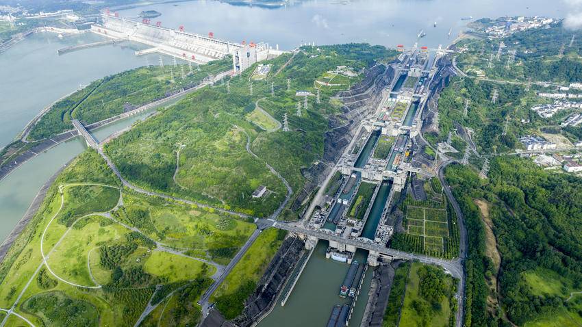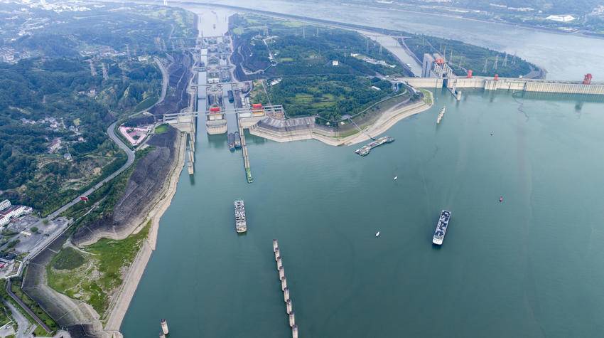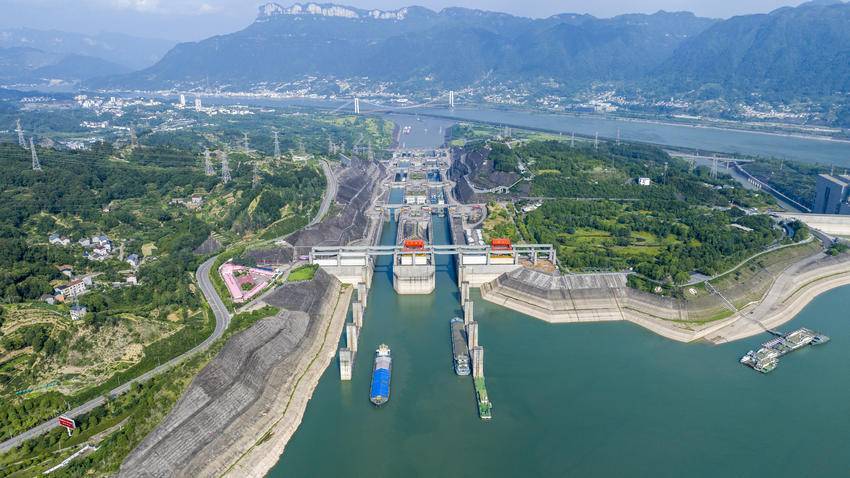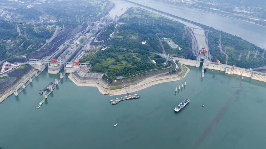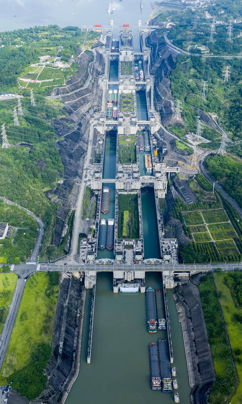 2025年6月29日,在宜昌市秭归县拍摄的客货运船舶有序通过三峡船闸和升船机。