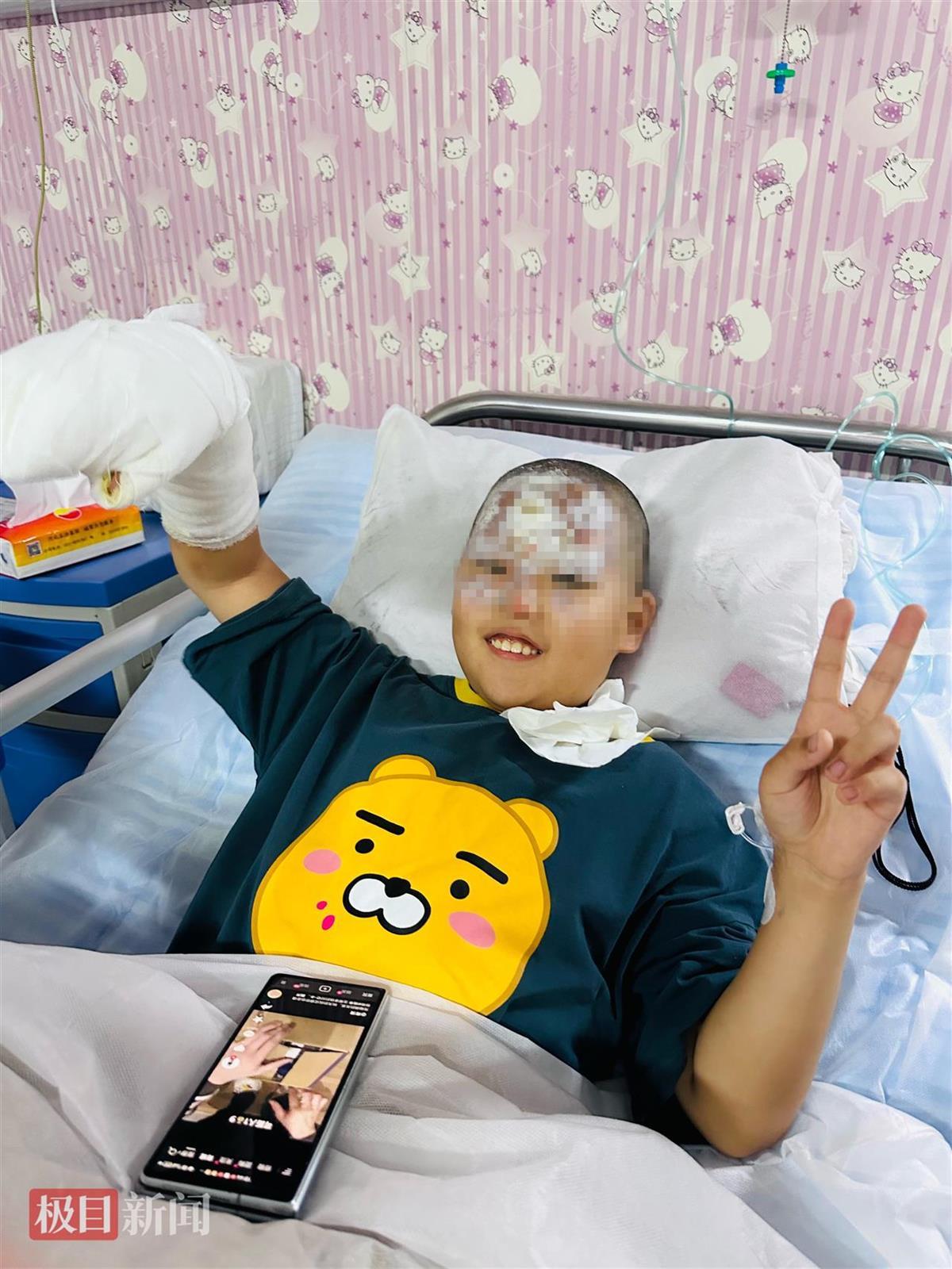 母亲苏女士向极目新闻记者回忆称,孩子是在2023年10月的一次火药试验中被炸伤,他们担心存在危险,就不允许孩子再碰这些。苏女士提供的图片显示,彼时的佟永锟住进医院,面部受伤,右手还缠着厚厚的绷带,但他依旧阳光开朗,做出“比耶”的手势。