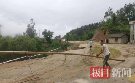 王磊立即上报,村两委第一时间发动附近村民参与险情处置,众人就地取材,利用树枝、竹竿、红塑料、警戒带等物品设置安全隔离带。同时,安排2名村民在道路两旁值守,有序引导过往车辆绕行。由于发现处置及时,保障了3个村及邻县蕲春县共2000余名群众的出行安全,无人员伤亡。