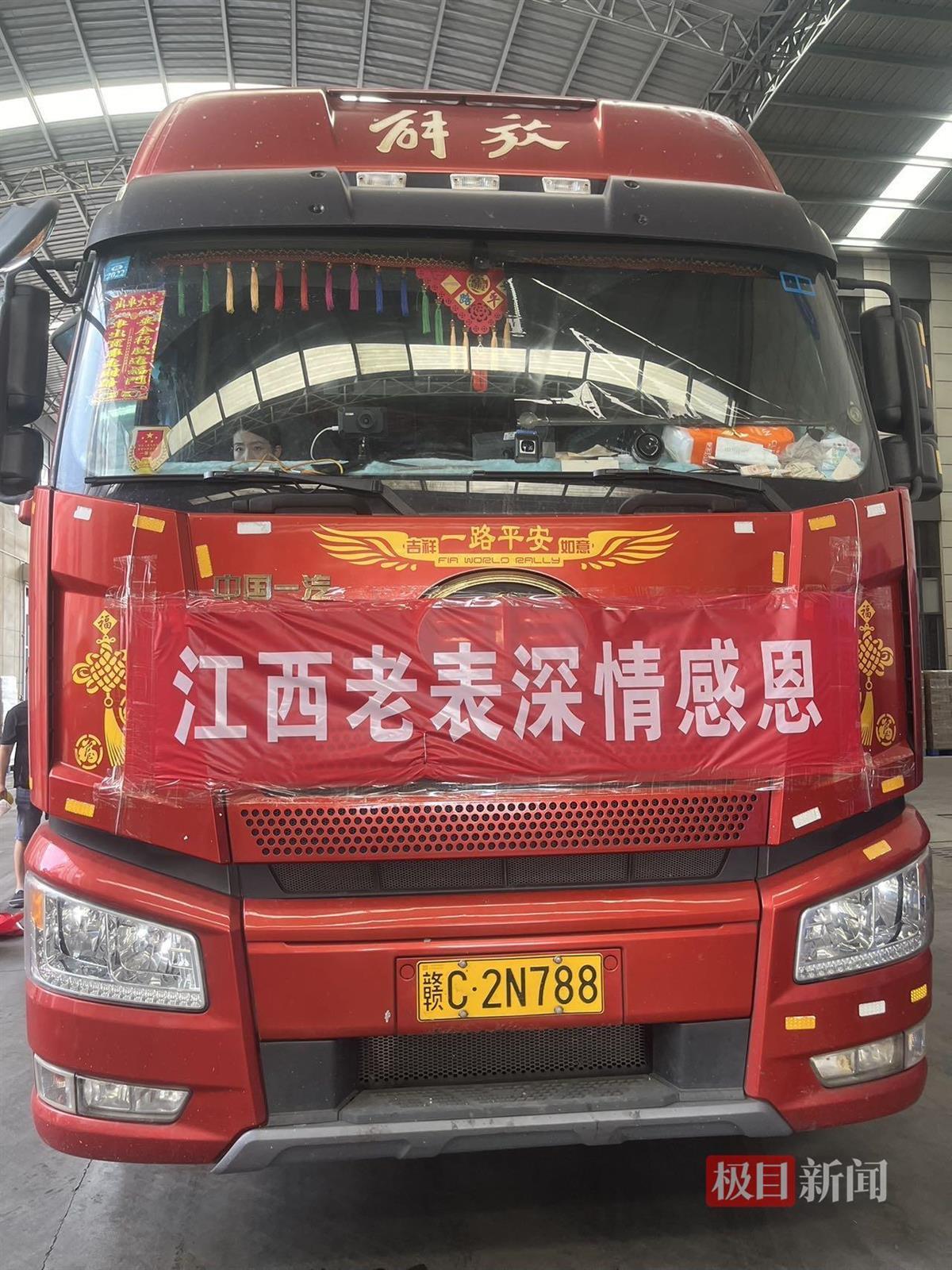 7月3日上午,“全网最幸运卡车司机”游国春的卡车挂上了爱心人士捐献的横幅,上面写着“江西老表深情感恩”。