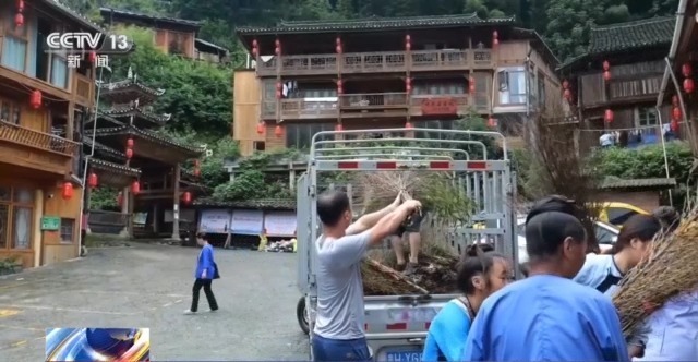 杨波招呼着村民,抓紧时间装车把扫把运往县城,前几天两次洪峰过境,杨波都奔赴一线参与突击救援,在发现垃圾清理的问题后,他主动联系了相关部门,了解到清淤现场确实存在扫把等工具的缺口后,赶紧回村和大伙儿商量。侗寨的村民很多都会制作扫把的技艺,大家知道后都积极参与赶制了这批竹扫把。记者跟着杨波往县城赶,路上他说这些天全村很多志愿者都在县城忙碌着。