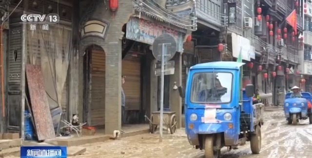 竹扫把质地软硬适中,相比于铁锹等工具更适合清理淤泥。顾不上吃饭,杨波赶紧带领村民往附近的古州老街赶,这里地势低洼,是比较难以清理的清淤点。大家用扫把将淤泥堆积在一起,很快将这个路口的淤泥清扫干净,接下来洒水车还要过来冲刷路面。