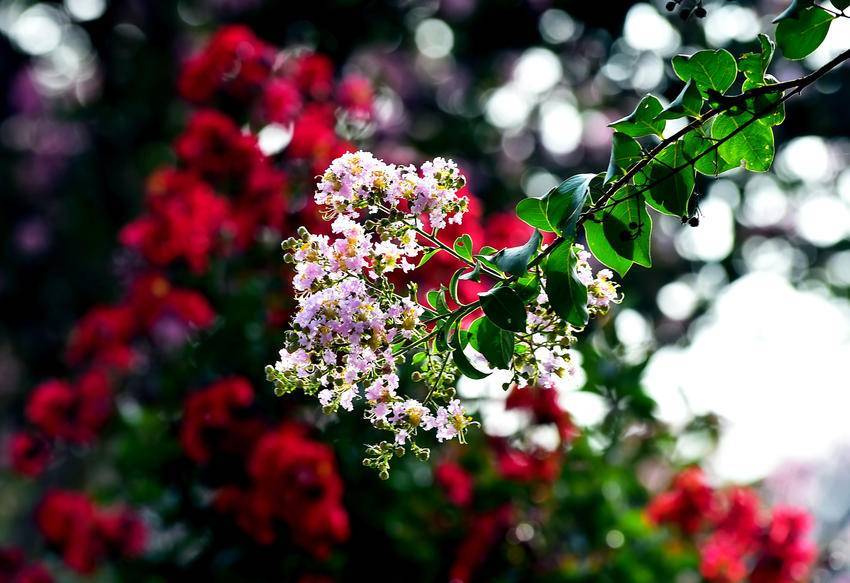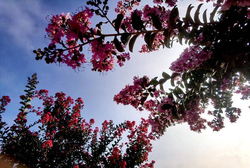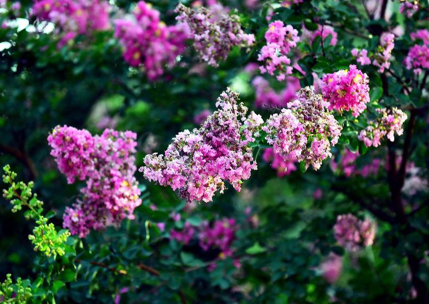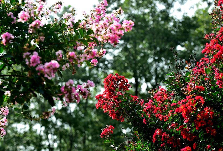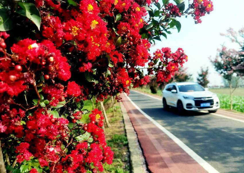 驱车在这条网红绿道上,映入眼帘的各色紫薇花美得让人心醉:梅红色的、白色的、粉红色的、紫色的花朵争奇斗艳,各展姿色。