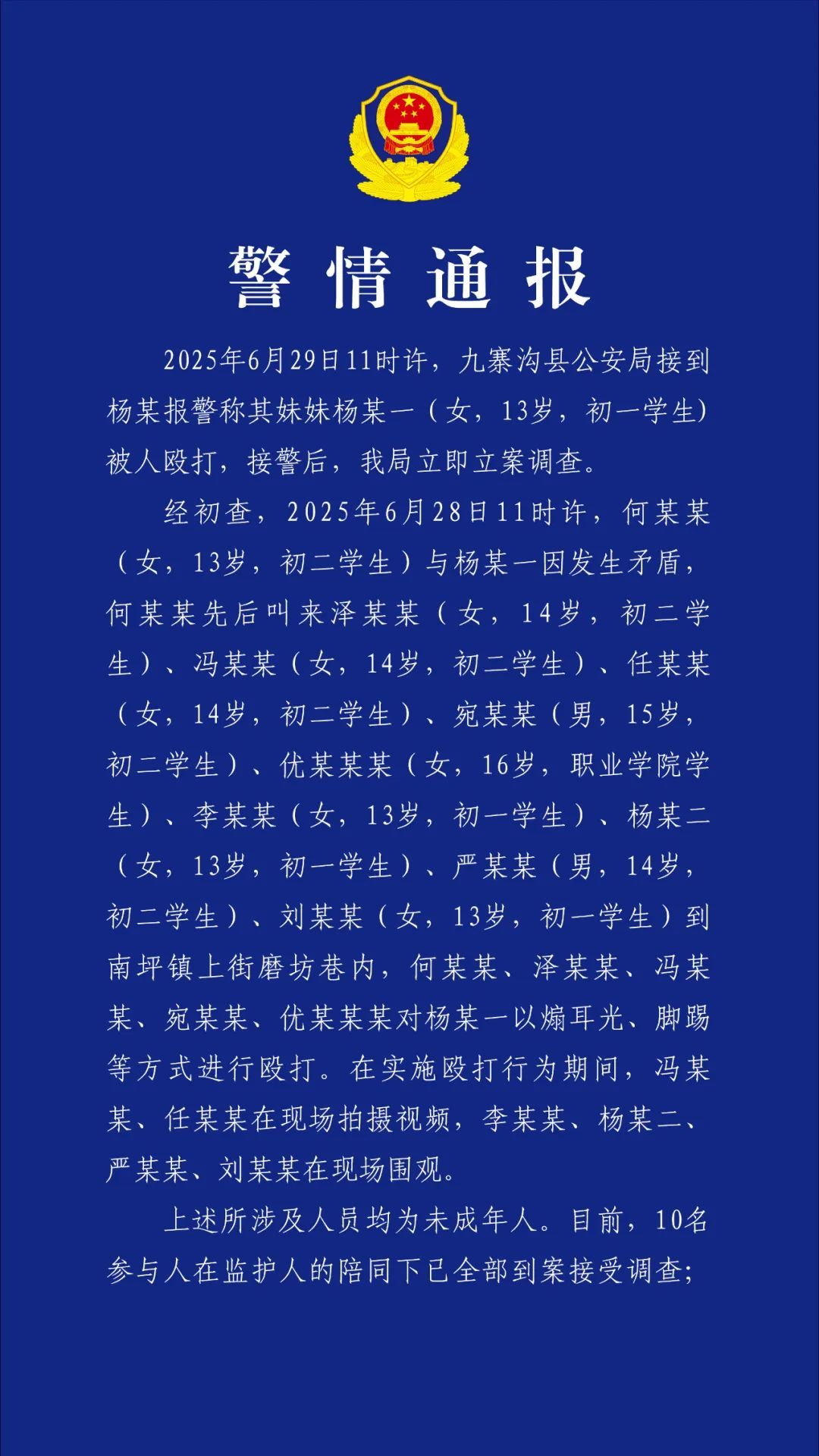 2025年6月29日11时许,九寨沟县公安局接到杨某报警称其妹妹杨某一(女,13岁,初一学生)被人殴打,接警后,我局立即立案调查。