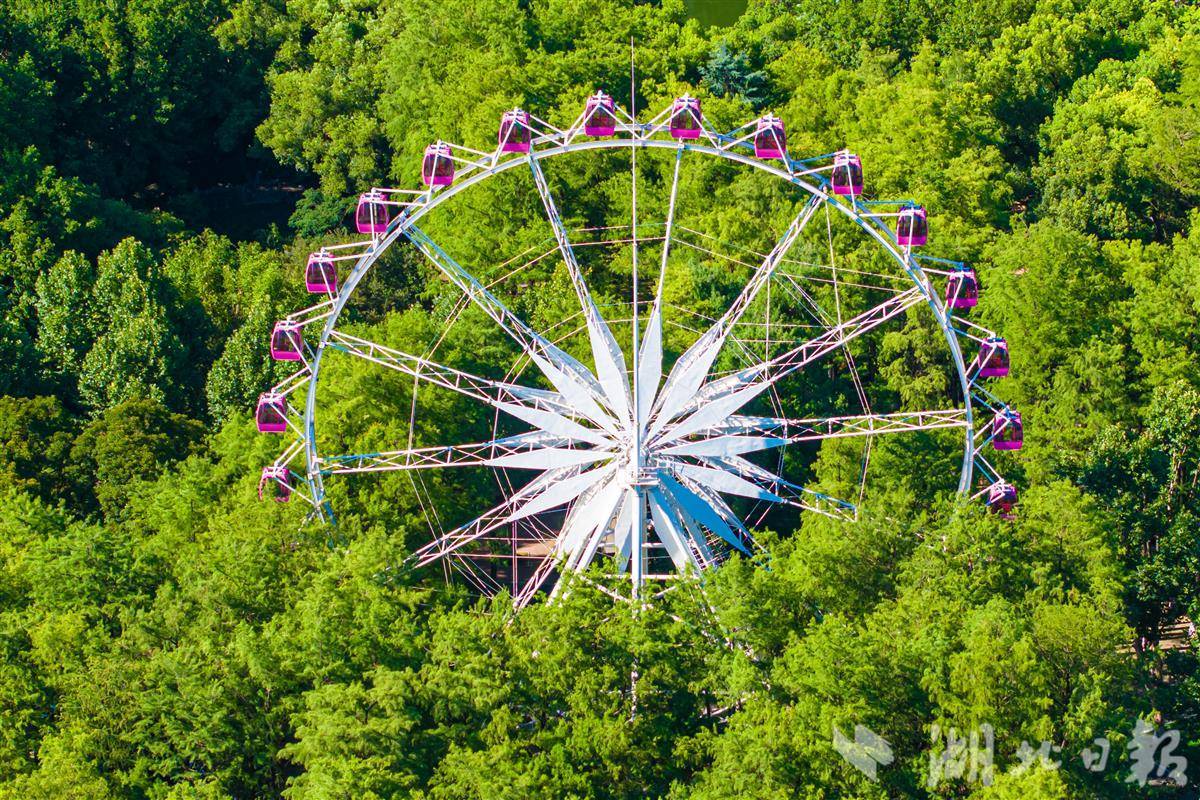 7月3日,中山公园42米高的摩天轮藏身于城市中心,与汉口金融街众多高楼同框。摩天轮石南紫色的靓丽吊箱,于苍翠的松林间探出头来,俯瞰着公园内熙熙攘攘的游人。