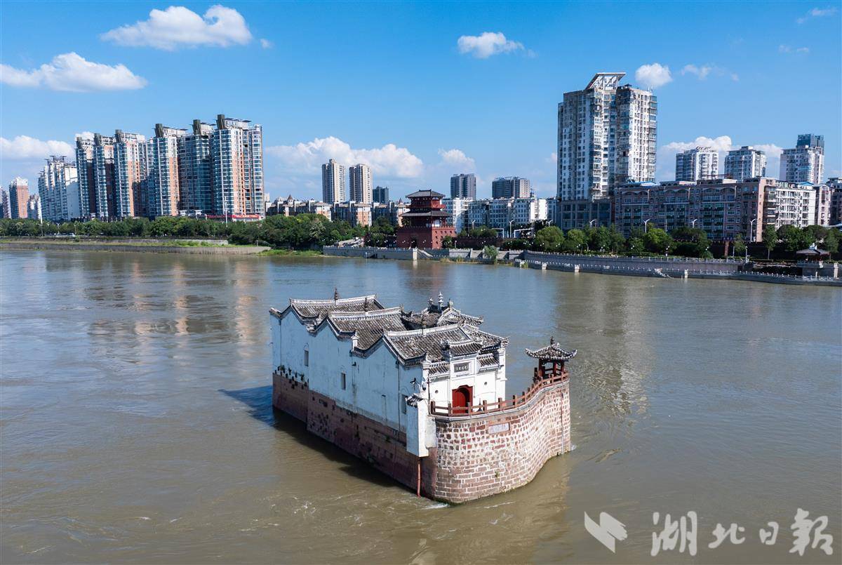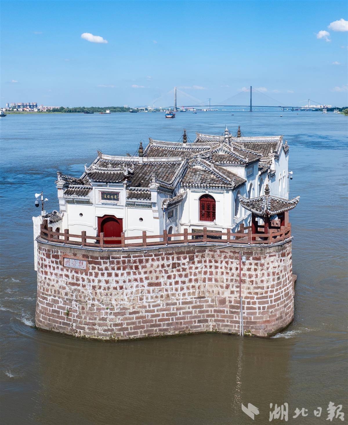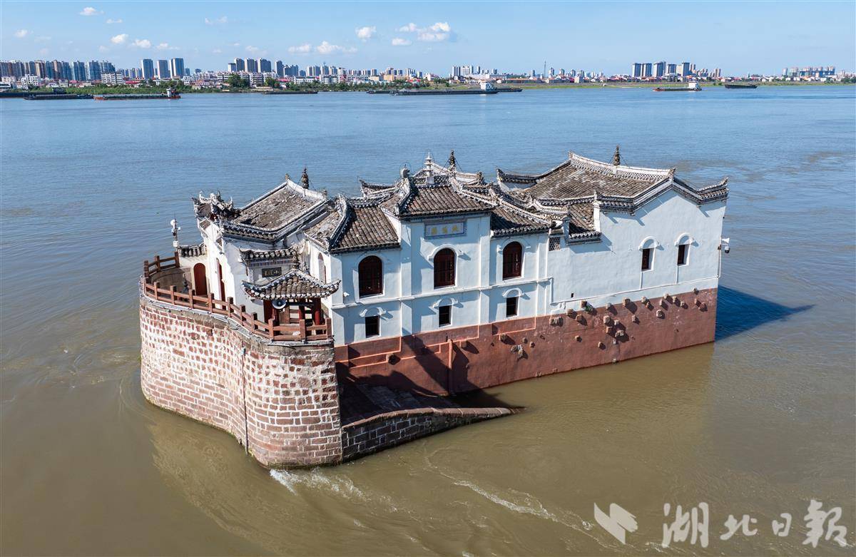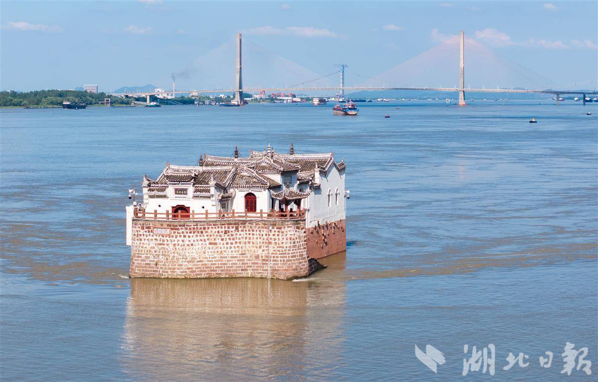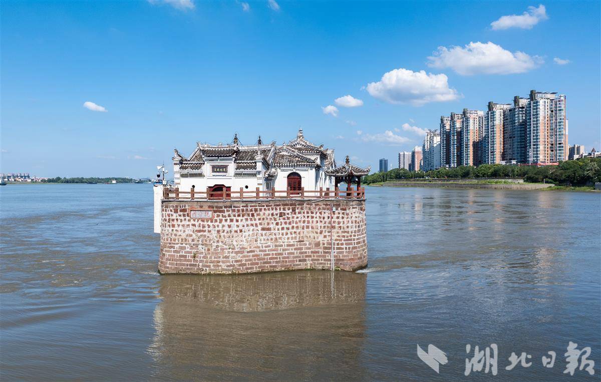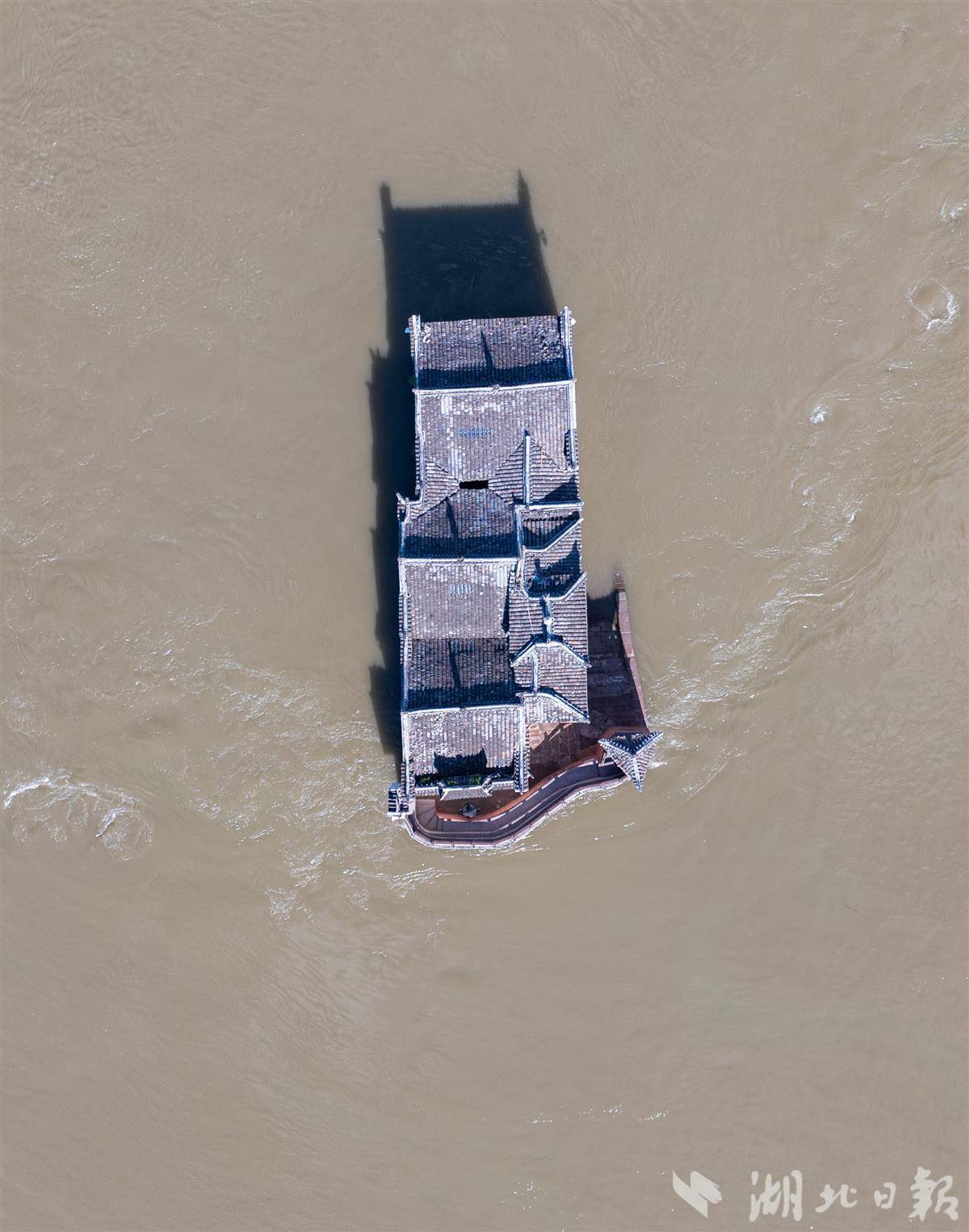 7月3日,长江鄂州段水位达21.06米,鄂州观音阁挡水墙基座被淹。有“万里长江第一阁”之称的鄂州观音阁,屹立长江近700年不倒。其建于长江中心的巨型礁石上,倚石起墙,孤悬水面,与礁石巧妙融为一体,因此观音阁又称龙蟠矶寺。