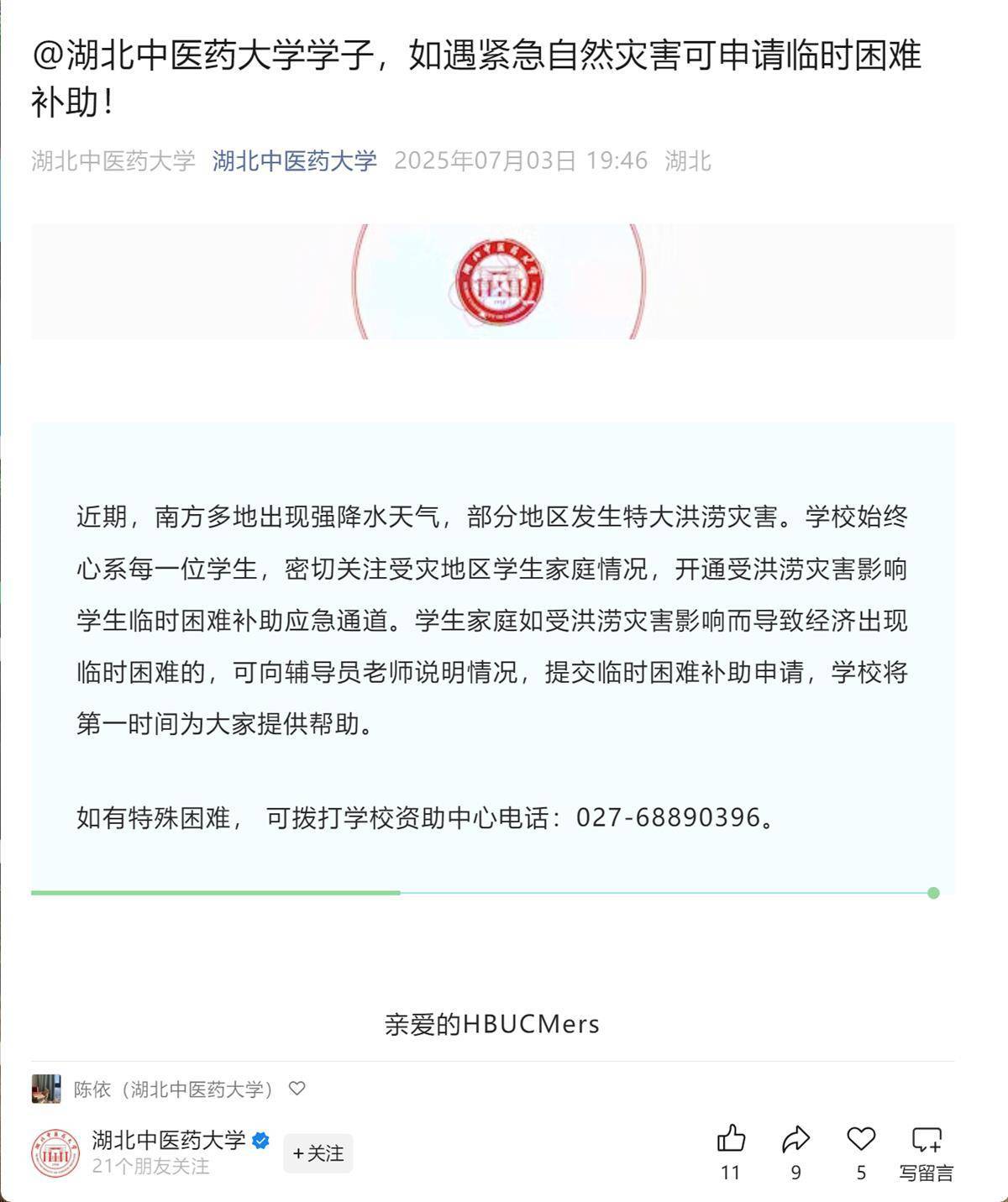 湖北日报讯(记者包东喜、实习生宋尚怡、通讯员陈依)7月3日晚,湖北中医药大学@该校学子,如遇紧急自然灾害可申请临时困难补助!