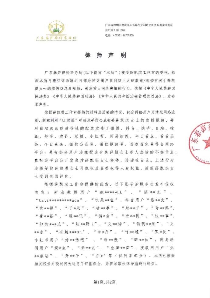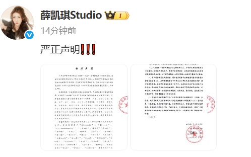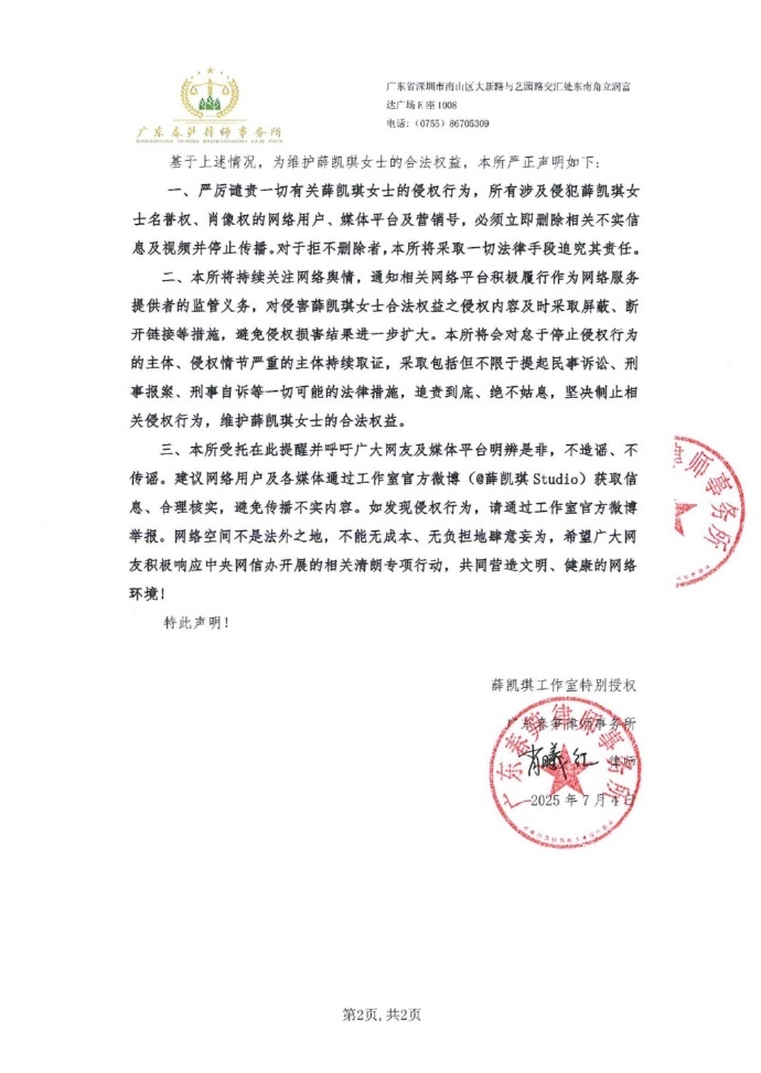 7月4日,薛凯琪方发布告黑声明:“网络恶意散布的关于薛凯琪女士的虚假信息及伪造视频,不仅严重侵害了薛凯琪女士的肖像权及名誉权,也扰乱了网络空间的正常秩序。 对此,薛凯琪工作室已委托律师依法处理,坚决通过一切法律措施维护自身合法权益,追究侵权者法律责任,绝不姑息! ”