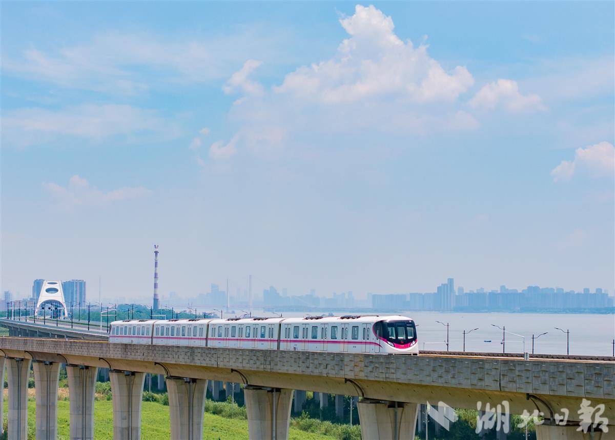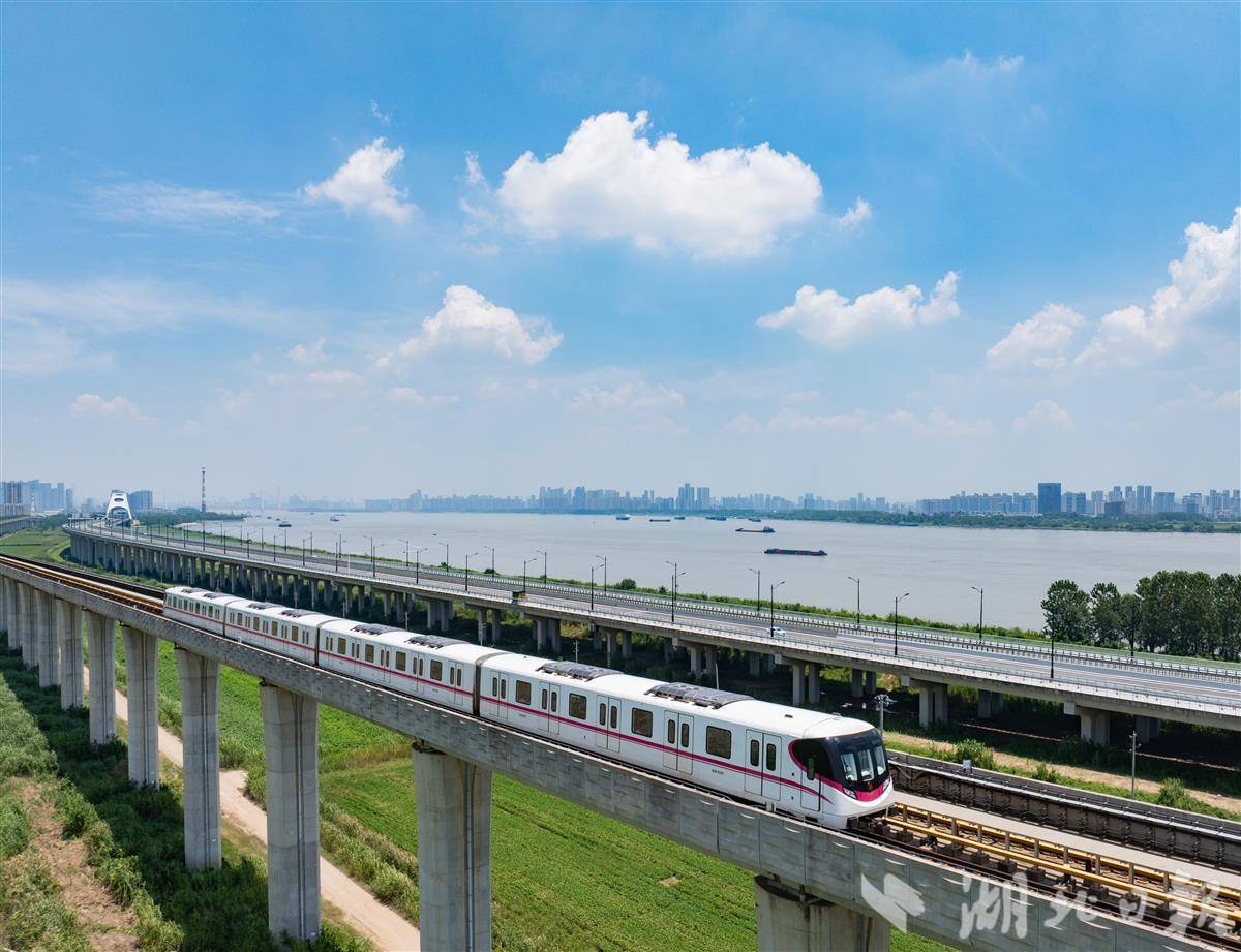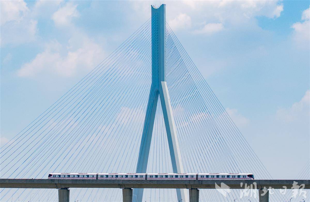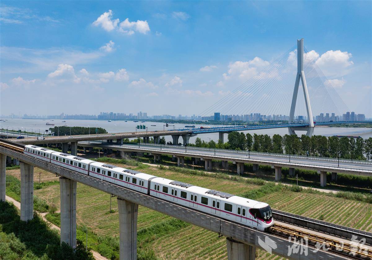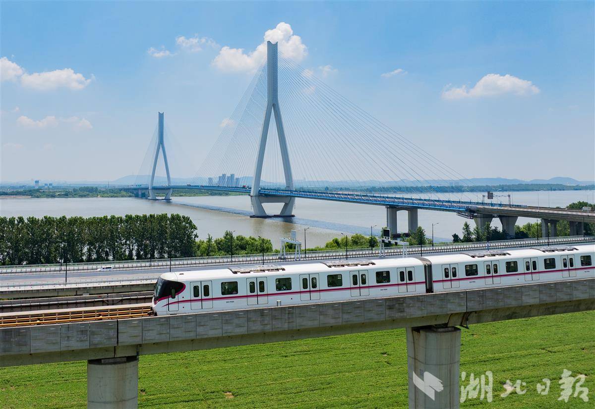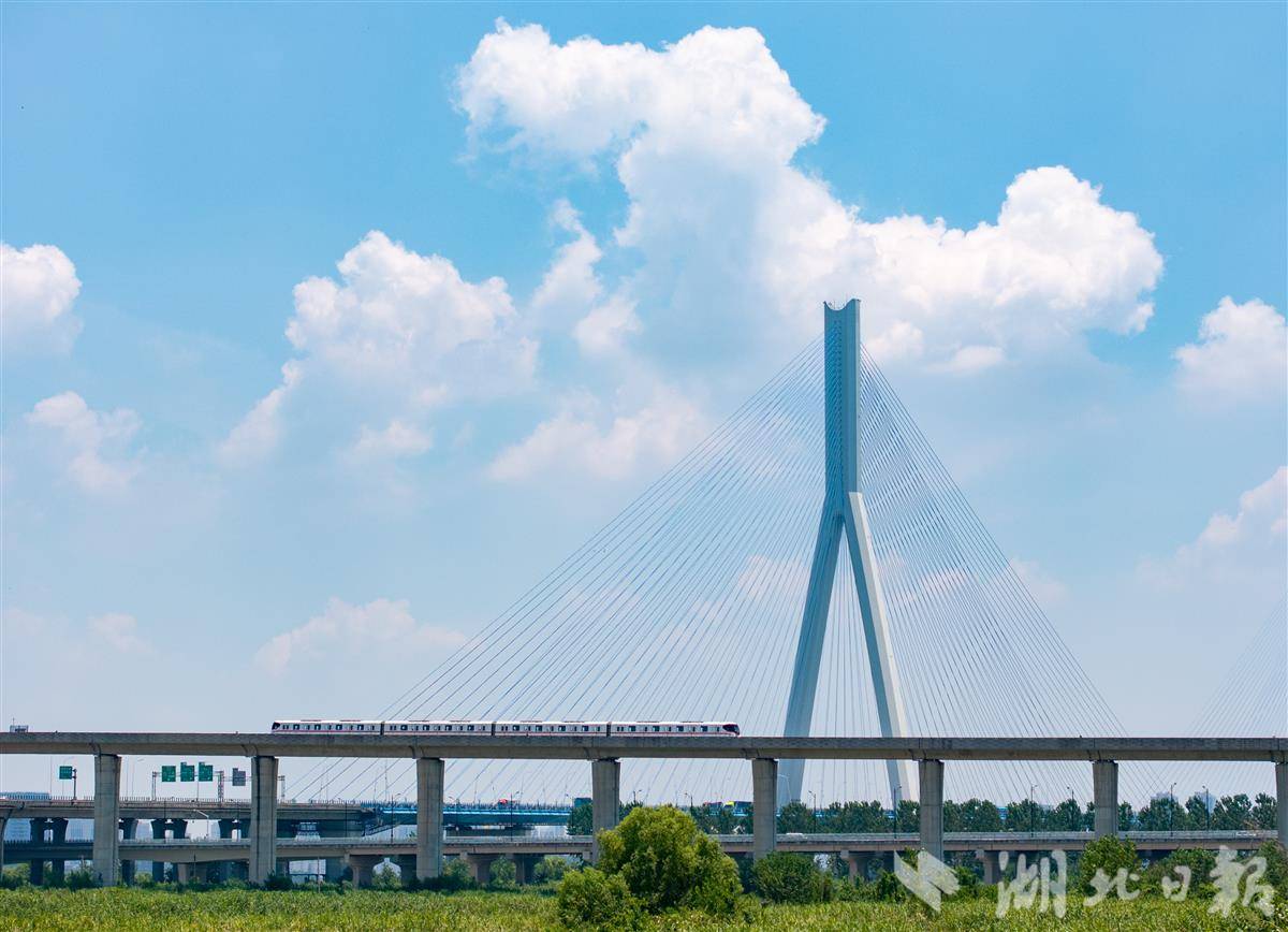 7月5日,武汉地铁16号线列车穿梭于沌口站和小军山站之间。蓝天白云下,地铁一路横跨沌口长江大桥,沿江而过,勾勒出最美观江地铁的独特景致 。(湖北日报全媒记者 柯皓 摄)