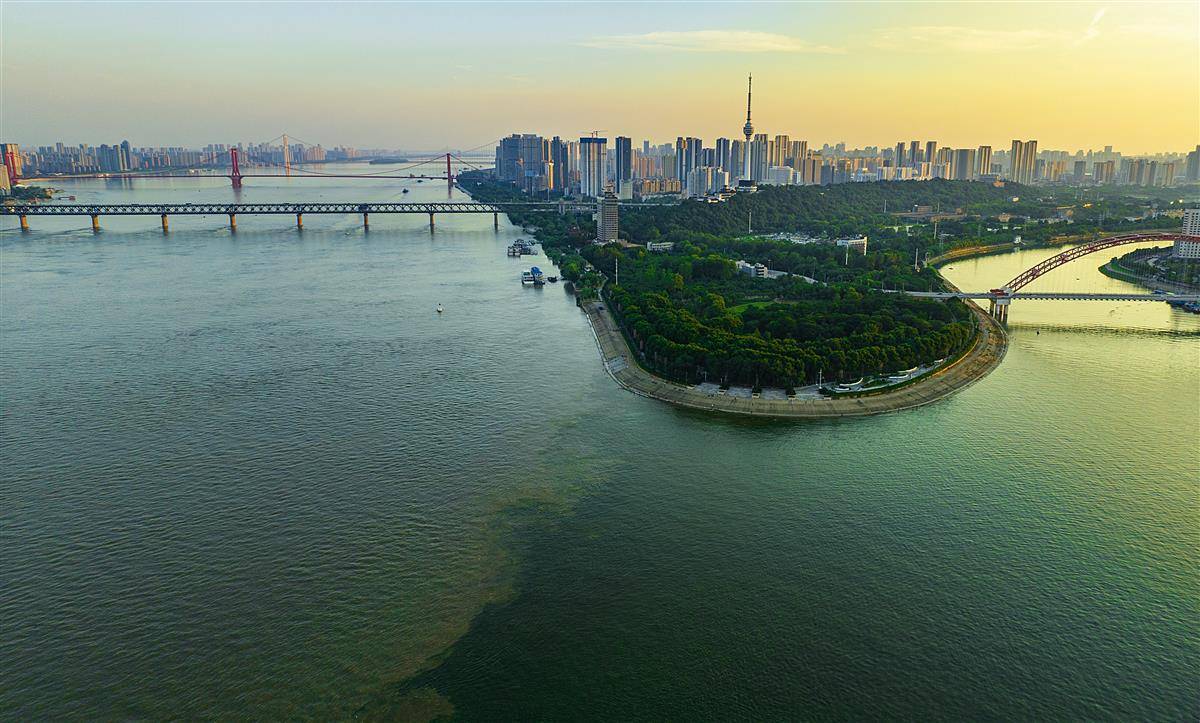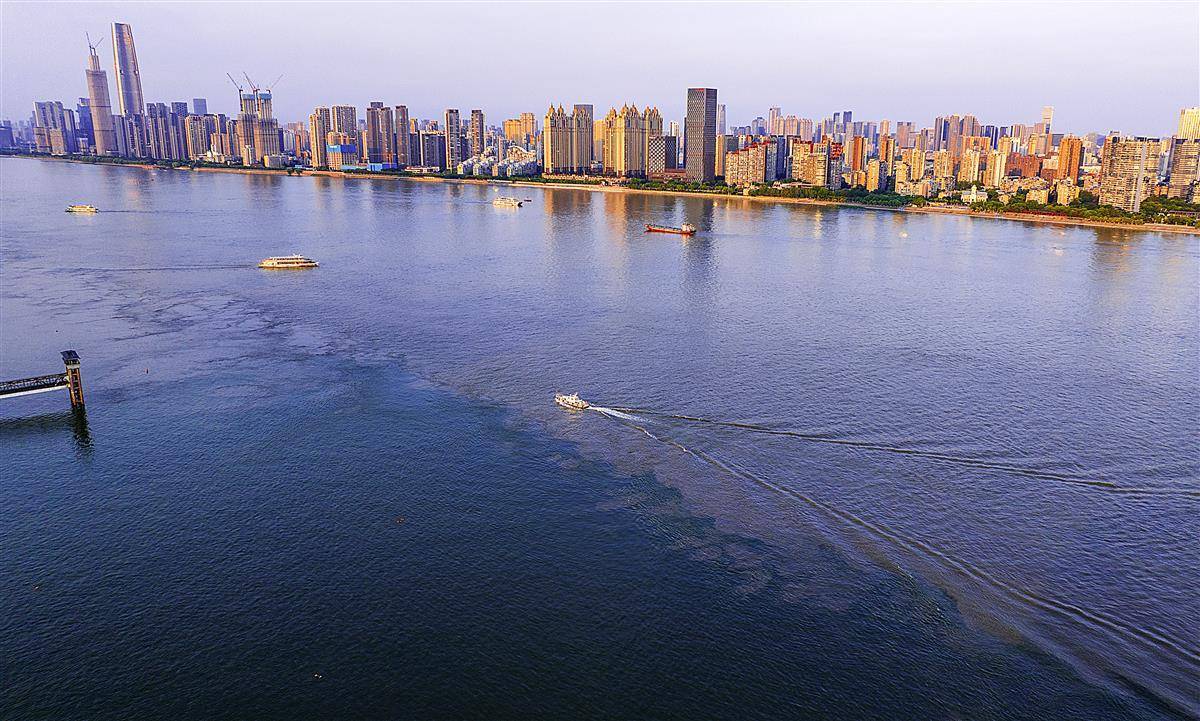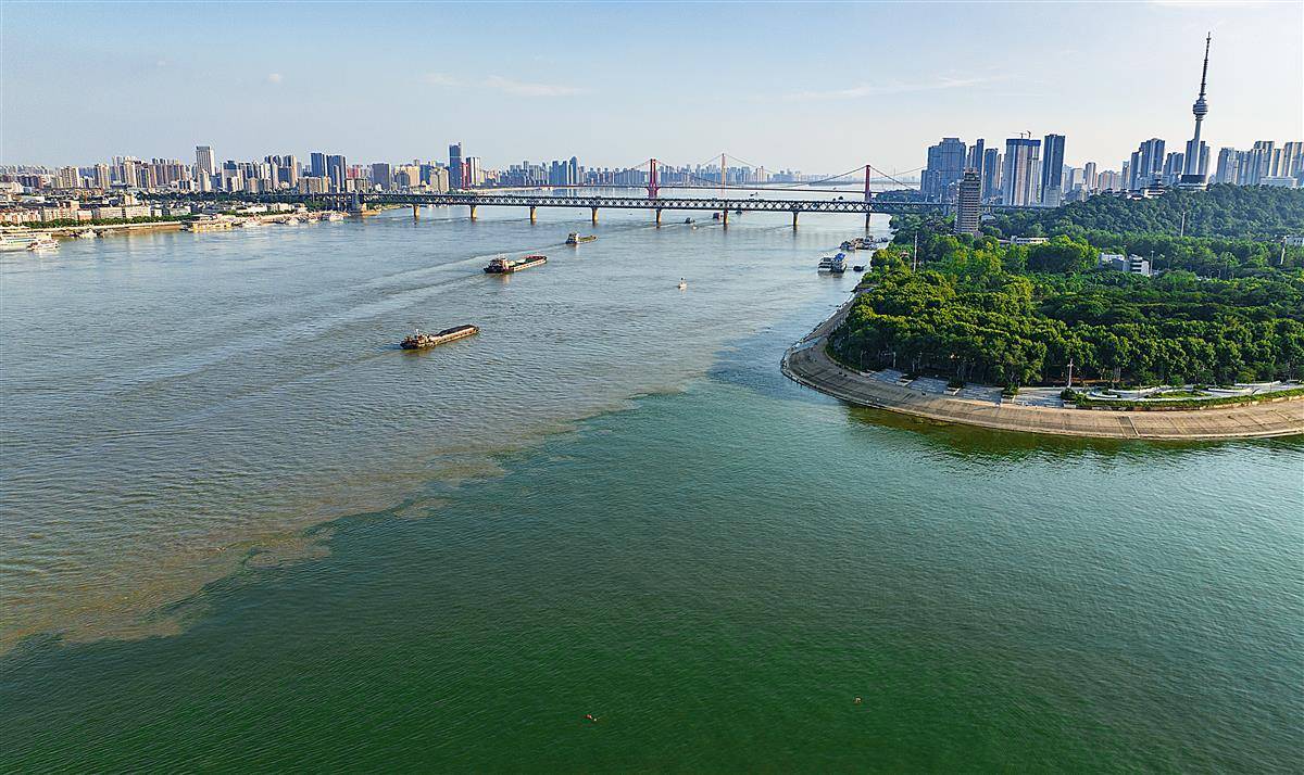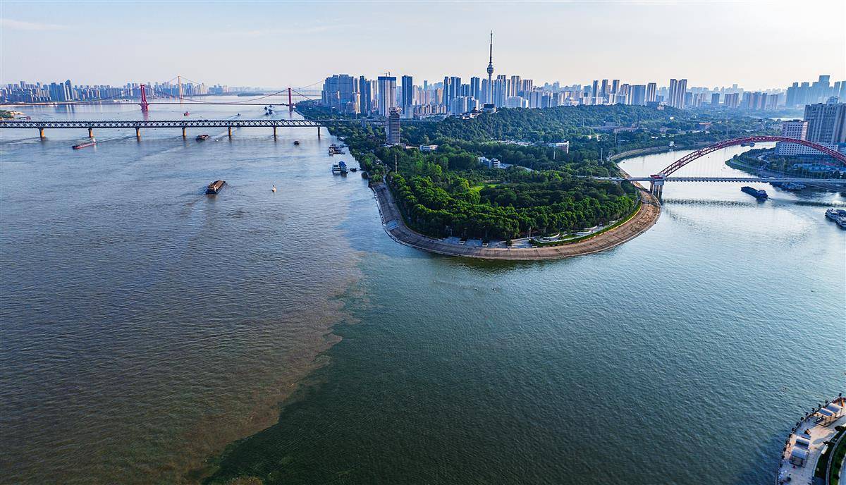 南岸嘴位于武汉三镇的汉阳,地处长江与汉水交汇口,是一处在两江间的圆弧形半岛,在这里雄浑的长江水与碧绿的汉江水流相遇,随着水位提升,形成了一道“泾渭分明”的水文景观。(湖北日报全媒记者 朱熙勇 摄)
