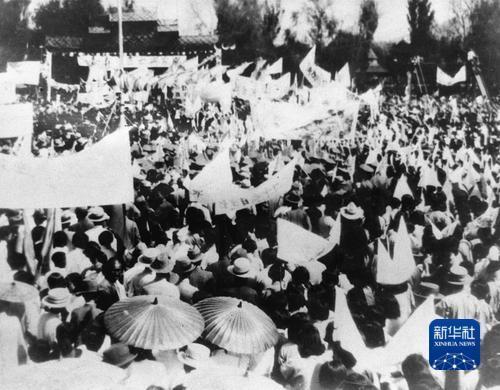 这是西安各界人民示威游行,拥护中国共产党的抗日救国主张,要求国民党政府停止内战,一致抗日。