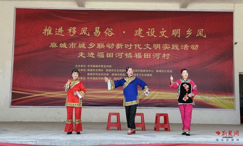 荆楚网(湖北日报网)讯(通讯员王睿、罗干、彭兆杰)7月3日上午,“推动移风易俗 建设文明乡风”麻城市城乡联动新时代文明实践活动在福田河镇菊乡文化大舞台举行。活动通过理论宣讲、文艺演出、政策解读等多种形式,重点聚焦文明婚俗等移风易俗内容,以多元形式引导村民破陈规、除陋习,传递文明理念。