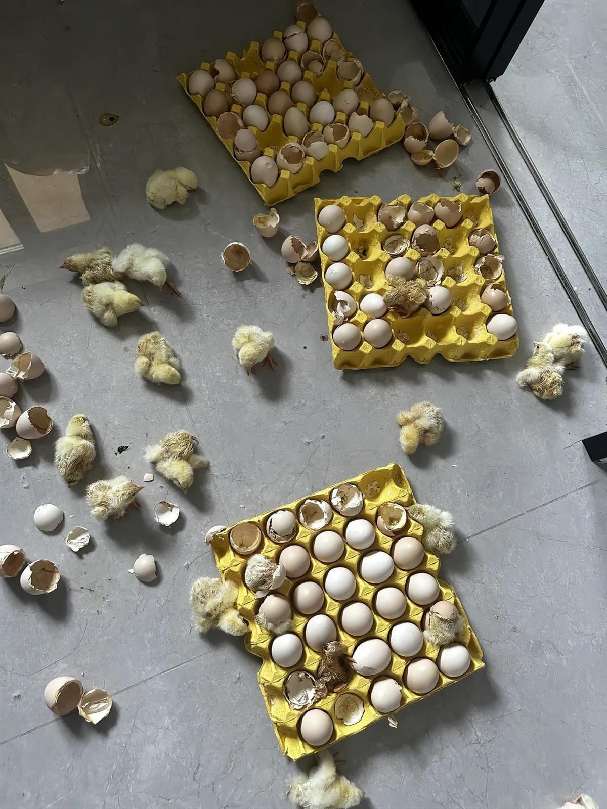 7月7日,该网友发布视频称,自己离家了两天,返家后打开门发现,家里竟然满地都是小鸡,原来是家里此前用来吃的“活珠子”孵化出了小鸡,看到时已经孵出了四五十只,还有一些正在破壳,没有完全孵出。