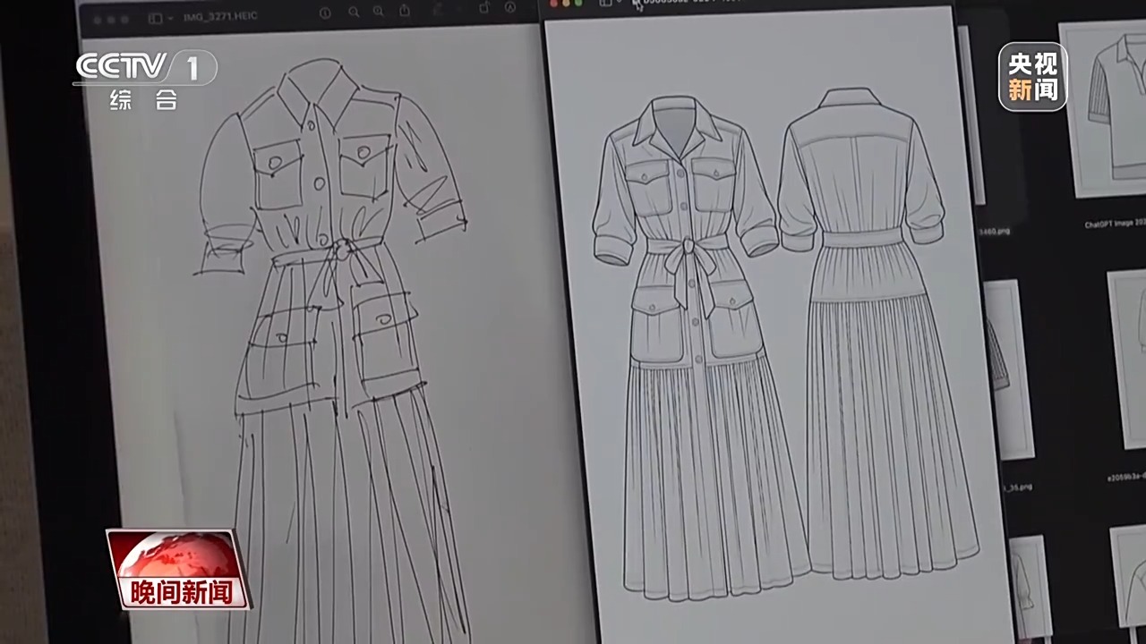 服装设计师 刘旭媛:两件连衣裙,我自己来画的话可能要画上一个礼拜大概,但是(用AI)我用了一天的时间,我就把所有的素材都生成出来了。