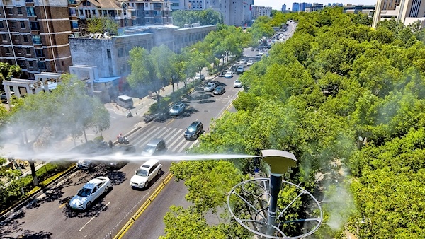7月9日,武汉东湖高新区民族大道,14组智能喷淋装置“上岗”,为酷暑出行的市民降温。日前,由光谷建设公司负责实施的民族大道道路喷淋抑尘系统工程正式完工并投入使用。在雄楚大道至南湖大道区间约2公里长的路段上,共安装14组智能喷淋装置。每组装置能覆盖杆塔周围25-30米的范围,并借助微风进行扩散。经过测算,智能喷淋装置能有效降低周边环境温度近5℃。