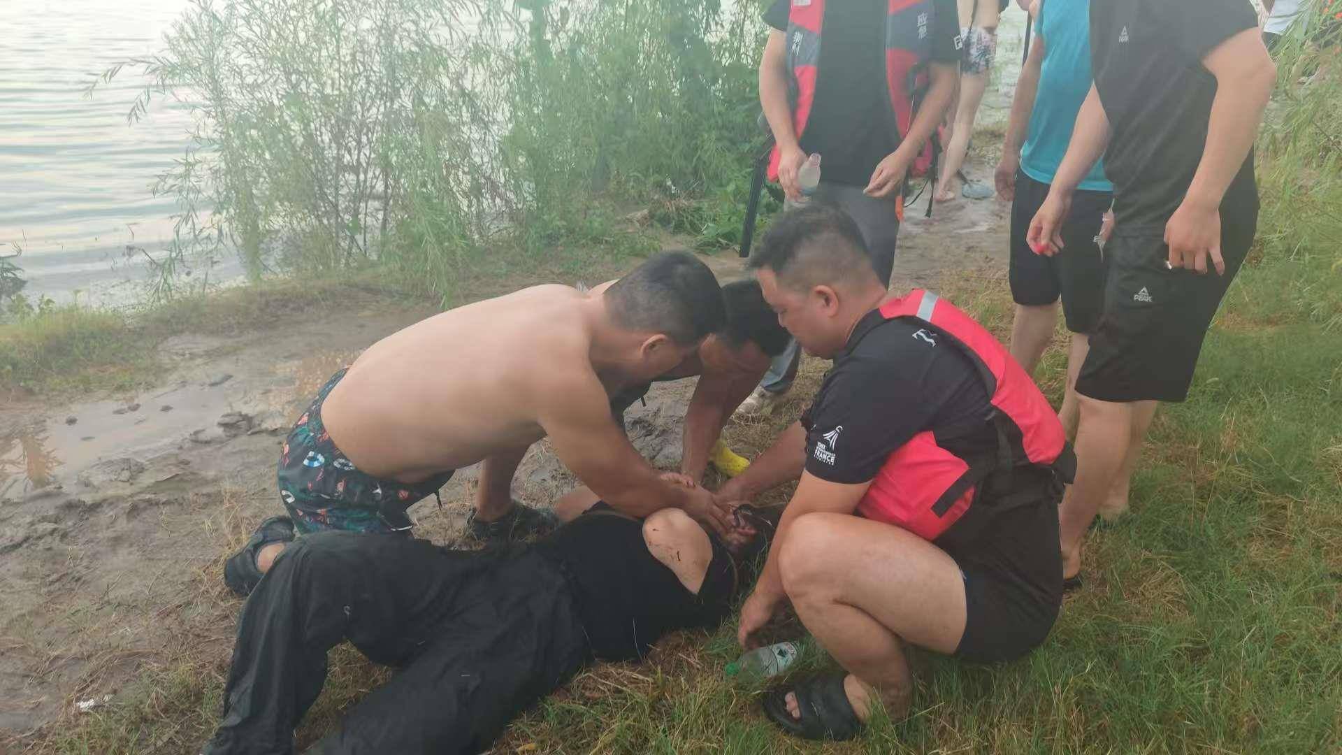 队员们立即飞奔至指定地点,淮俊杰、李燕平、唐威三位队员率先在江边水草中发现溺水女子,此时女子处于半昏迷状态。唐威第一时间拨打120急救电话和110报警电话,淮俊杰与李燕平则迅速将女子搀扶至岸边草丛。三人立即采取急救措施,清除口鼻堵塞物,并进行胸外心脏按压。